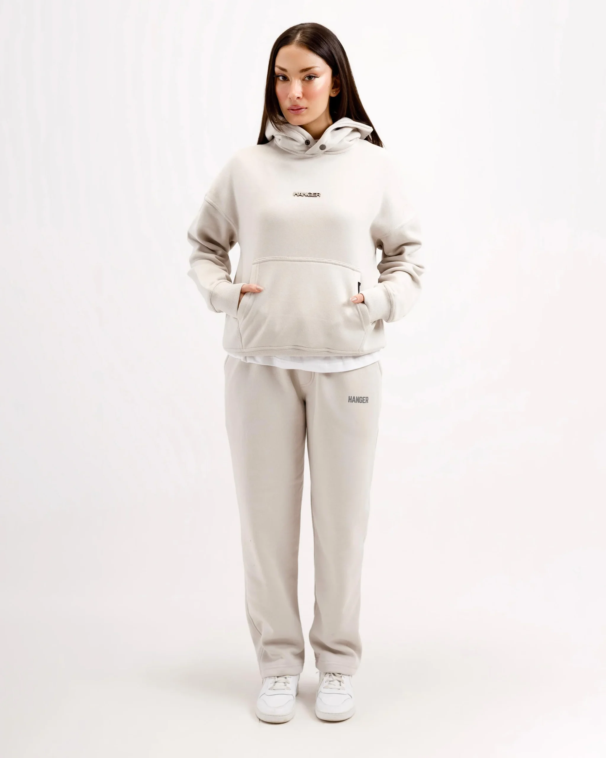 Super soft and ultra comfortable oversized hoodie with kangaroo pockets, ribbed hems & drop shoulders featuring a metal logo badge.