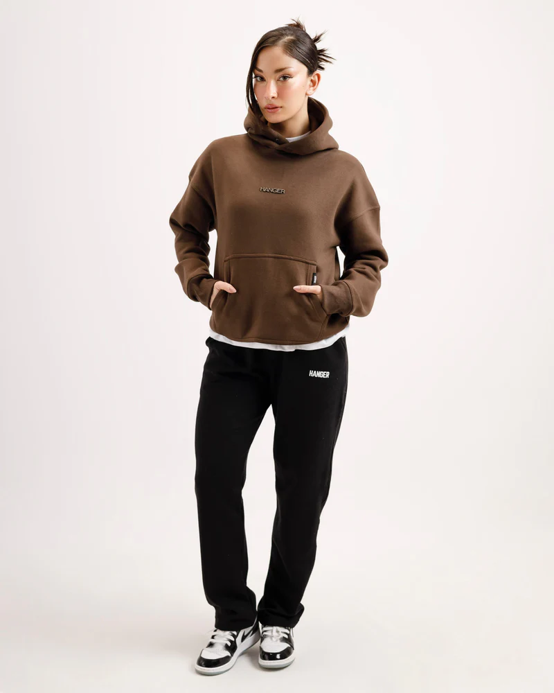 Super soft and ultra comfortable oversized hoodie with kangaroo pockets, ribbed hems & drop shoulders featuring a metal logo badge.